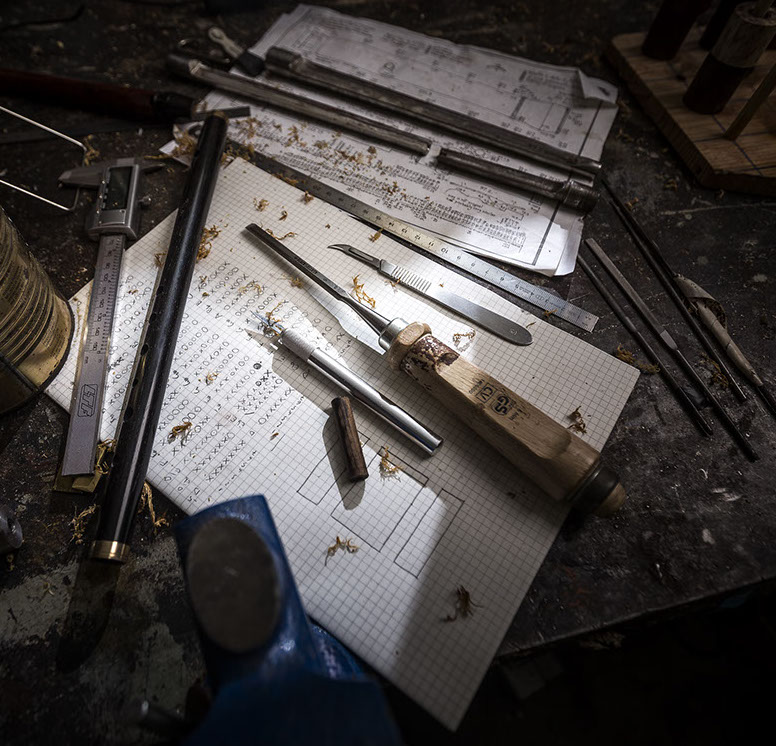 Nella realizzazione dei miei strumenti parto dallo studio dei piani di costruzione di modelli storici o da misurazioni effettuate direttamente su strumenti originali. Secondo le misure riportate sui progetti o acquisite, modello gli alesatori e gli strumenti necessari alla preparazione di una copia il più possibile aderente allo strumento originale.